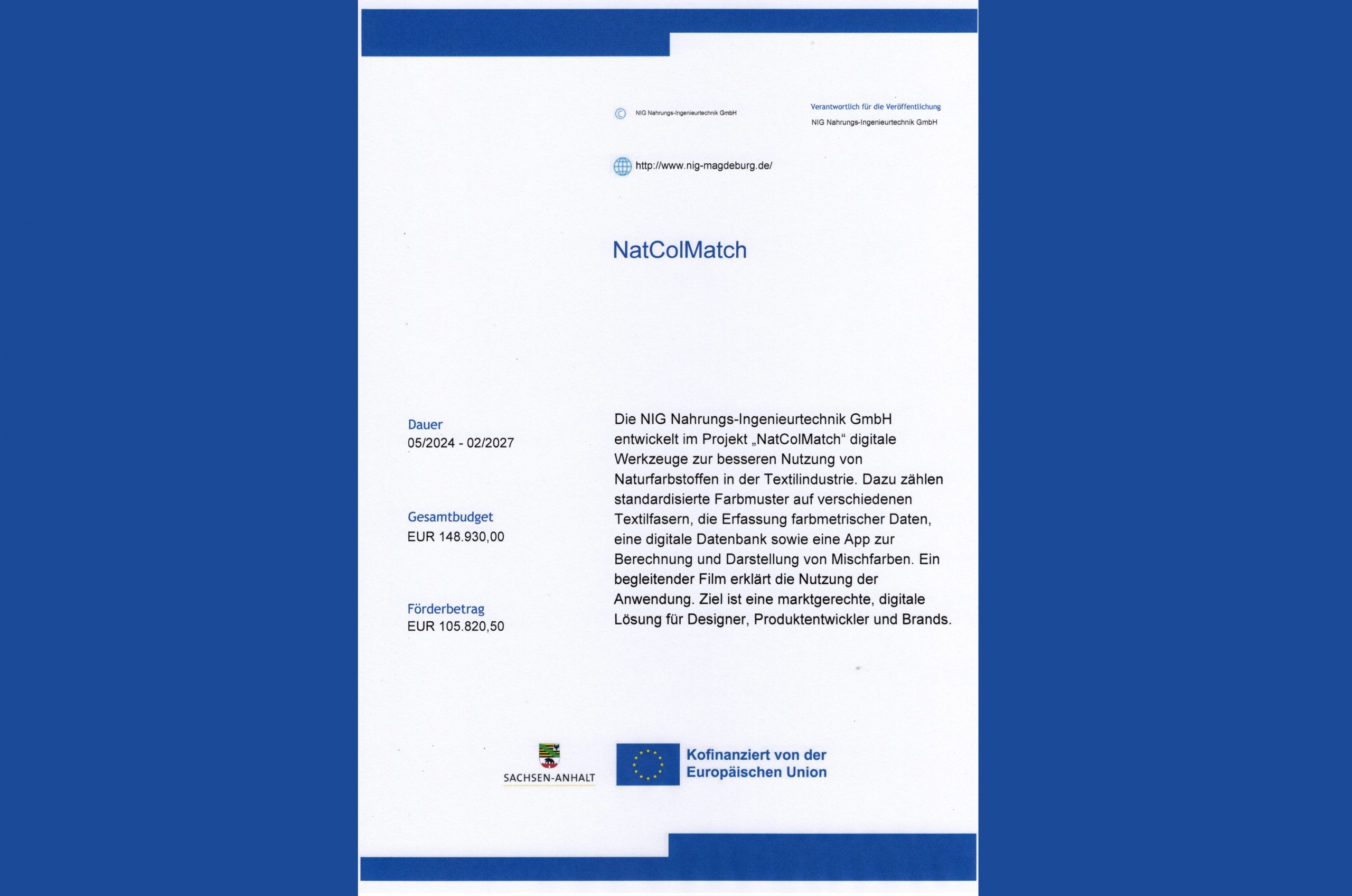 Dazu zählen standardisierte Farbmuster auf verschiedenen Textilfasern, die Erfassung farbmetrischer Daten, eine digitale Datenbank sowie eine App zur Berechnung und Darstellung von Mischfarben.